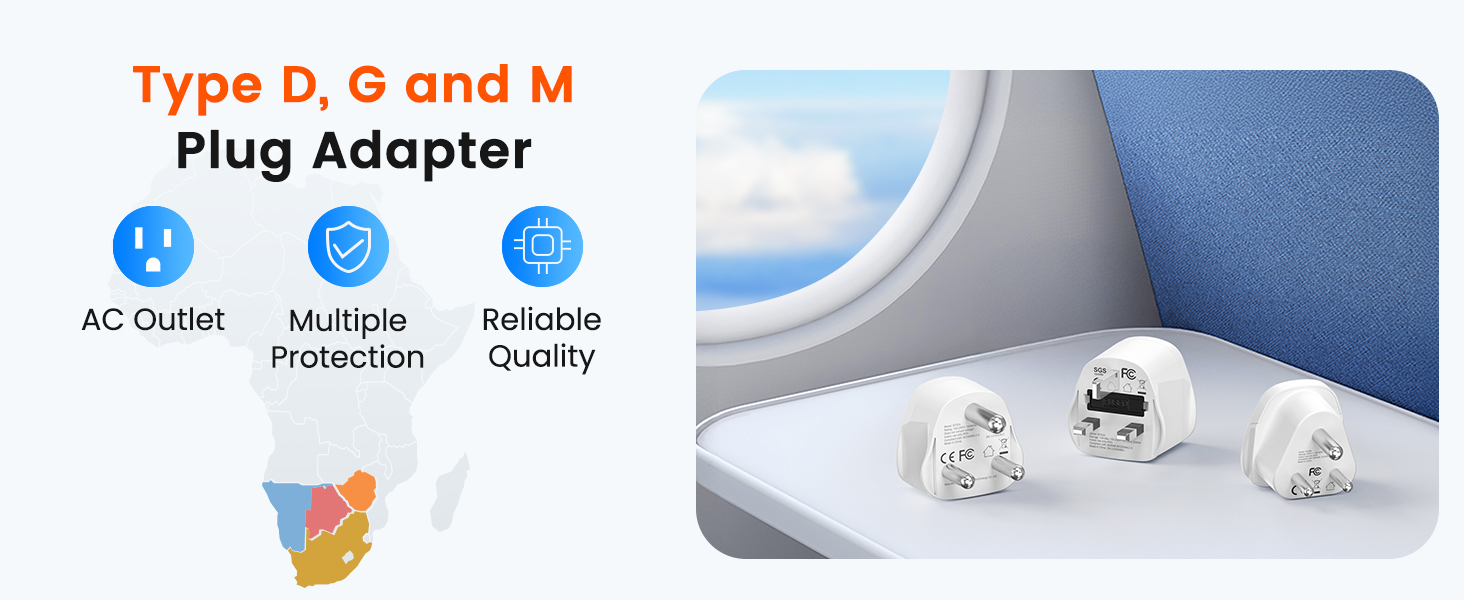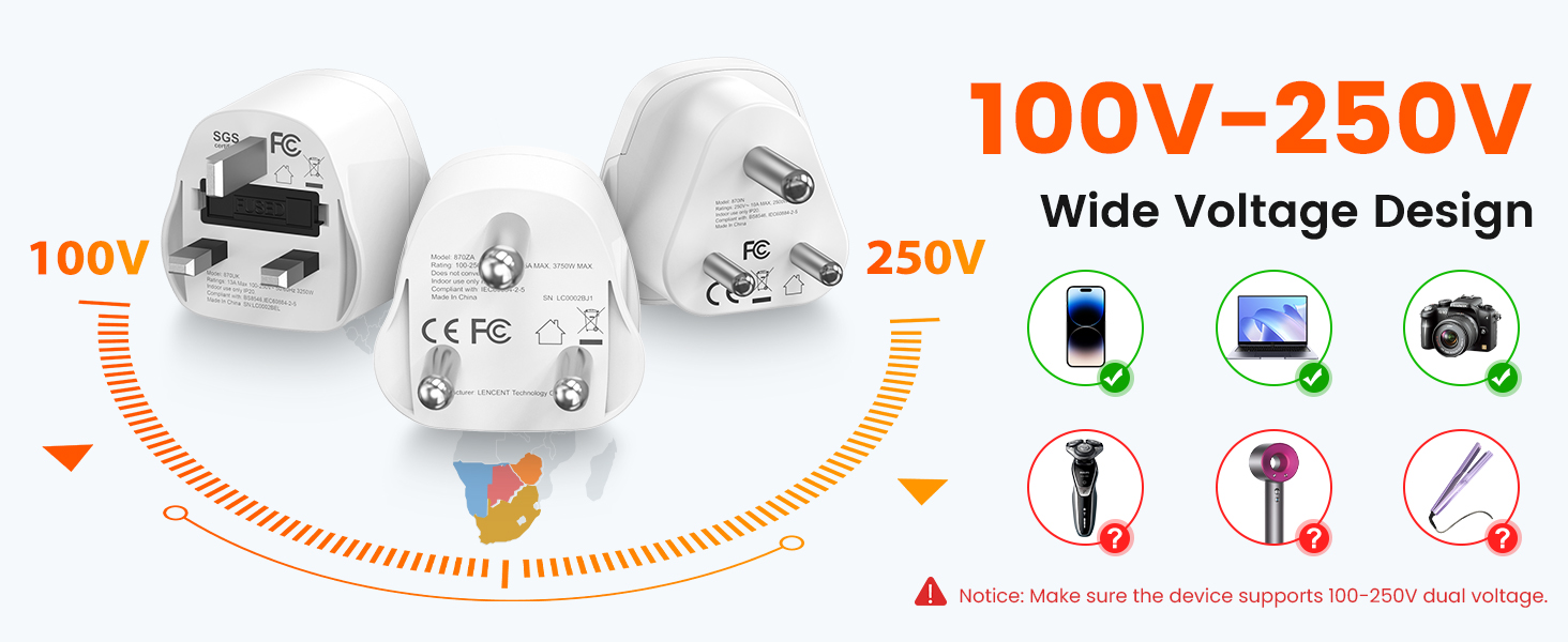 Travel Adapter Kit: Specialized Type D, M and G Travel Adapter Combo. A perfect all-in-one solution for your journey across countries where multiple plug standards are used. Keep your essential devices powered no matter where your travels take you Suitable Countries: Sri Lanka, Botswana, South Africa, Namibia, Zimbabwe, Nepal, India, Bhutan, Pakistan and more Portable Compact Size-This LENCENT type D, M and G travel plug adapter is compact and lightweight, easily slips into any bag. Wherever you're traveling, working overseas, this adaptor is an ideal companion for bringing along without taking up much space Wide Compatibility: This travel adapter kit is compatible with a wide range of devices, including smartphones, power banks, iPhones, laptops, and cameras. Maximum output-Type D: 10A, 2500W at 250V; Type G: 13A, 3250W at 250V; Type M: 16A, 4000W at 250V Note: This is NOT A VOLTAGE CONVERTER. This adapter is only compatible for devices that support 100V-250V dual voltage, especially for hair dryer, straightener, electric toothbrush or razor, otherwise you may need a power voltage converter