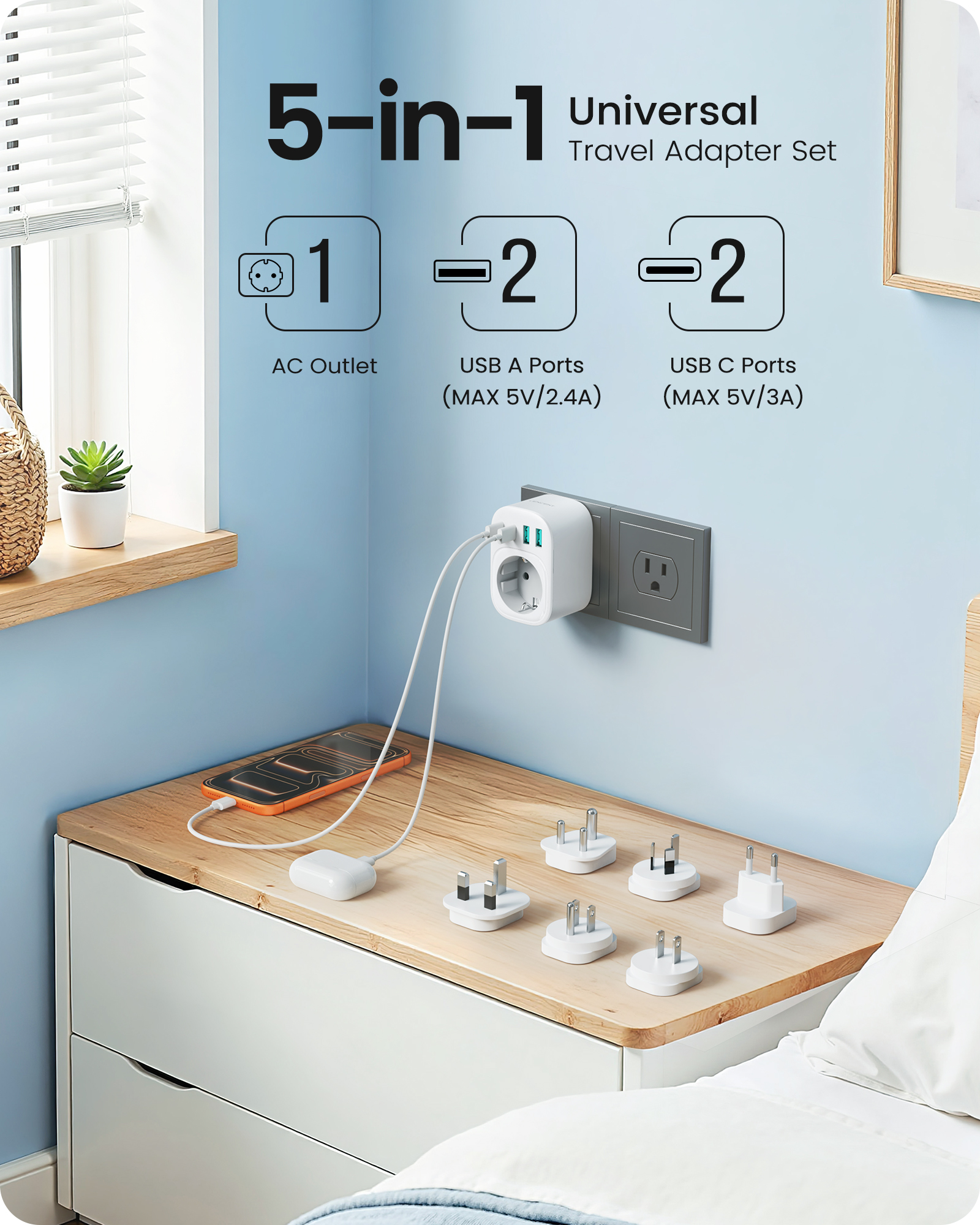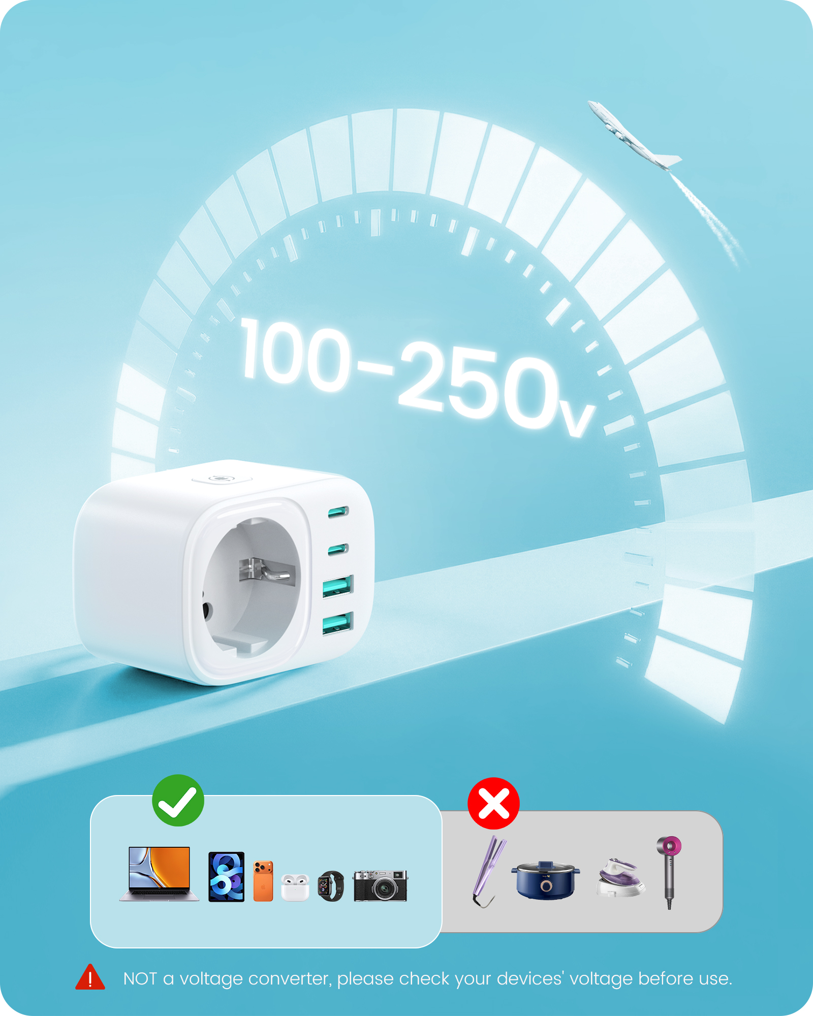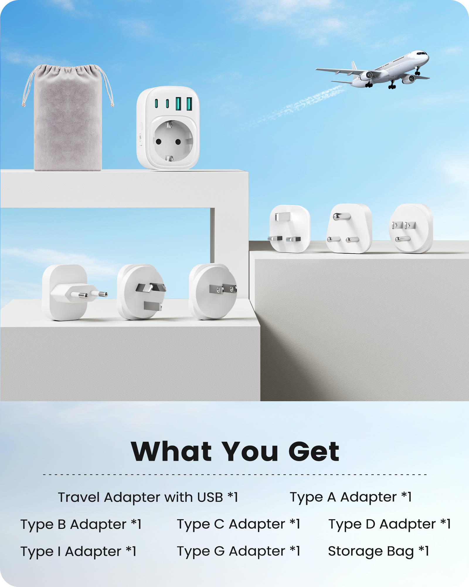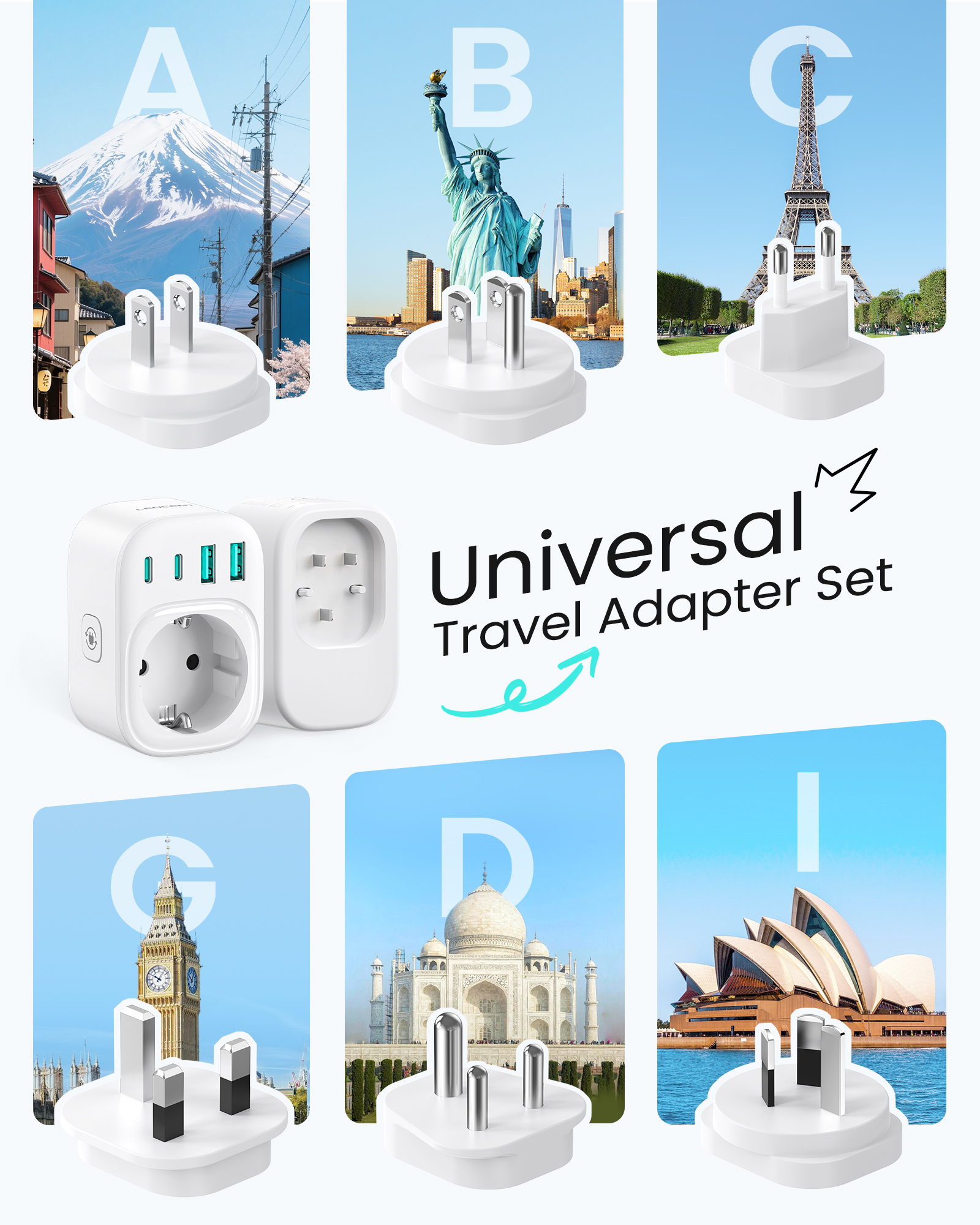 ---[International Travel Adapter] This worldwide travel adapter set includes 6 detachable plug attachments and can be used in over 180 countries, so you no longer need to worry about having the right plug. Type A: Mainly used in Japan, USA, Philippines, Mexico, China, Thailand, Anguilla, Colombia, and other countries. Type B: Mainly used in the USA, Canada, Mexico, Colombia, Thailand, American Samoa, and other countries. Type C: Mainly used in most European countries such as Germany, France, Spain, Italy, the Netherlands, Portugal, Greece, Poland, Turkey, and other countries. --- Type D: Mainly used in India, Nepal, Sri Lanka, Pakistan, and other countries. Type G: Mainly used in the UK, Dubai, Malta, Hong Kong, Ireland, Tanzania, Cyprus, Scotland, and other countries. Type I: Mainly used in Australia, China, Argentina, New Zealand, Fiji, the Cook Islands, Samoa, and other countries. Our universal adapter features six plug types, making it the ideal choice for frequent travelers. ---[USB Fast Charging] This universal travel adapter comes with 1 AC outlet, 2 USB-C ports, and 2 USB-A ports. Advanced technology enables charging speeds of up to 3.0 A / 15 W on USB-C ports and up to 2.4 A / 12 W on USB-A ports, providing power for fast charging of a wide range of USB-powered devices such as smartphones, tablets, laptops, cameras, and more. Ideal for frequent travelers and business travelers. ---[Easy to Use and Carry] A included storage bag accommodates all plug accessories, keeping them within easy reach at all times. You can switch the required plug types anytime, anywhere—operation is extremely simple. Our travel adapter is compact (7.8*5.25*4 cm) and lightweight (88.3 g), taking up very little space in your luggage. Its compact size allows it to fit easily into a backpack or briefcase. ---[NO Voltage Converter] This adapter does not convert voltage from 110V to 220V or vice versa. Please ensure that your hair dryer, hair straightener, CPAP machine, electric toothbrush, or shaver supports dual voltage (100V-240V) before use; otherwise, you may need a separate voltage converter. ---[Switching Plugs] Assembly:① Align the plug with the connector.② Fully insert the plug until a click is heard.Disassembly:③ Press and hold the "Release" button.④ Pull the plug out of the adapter.