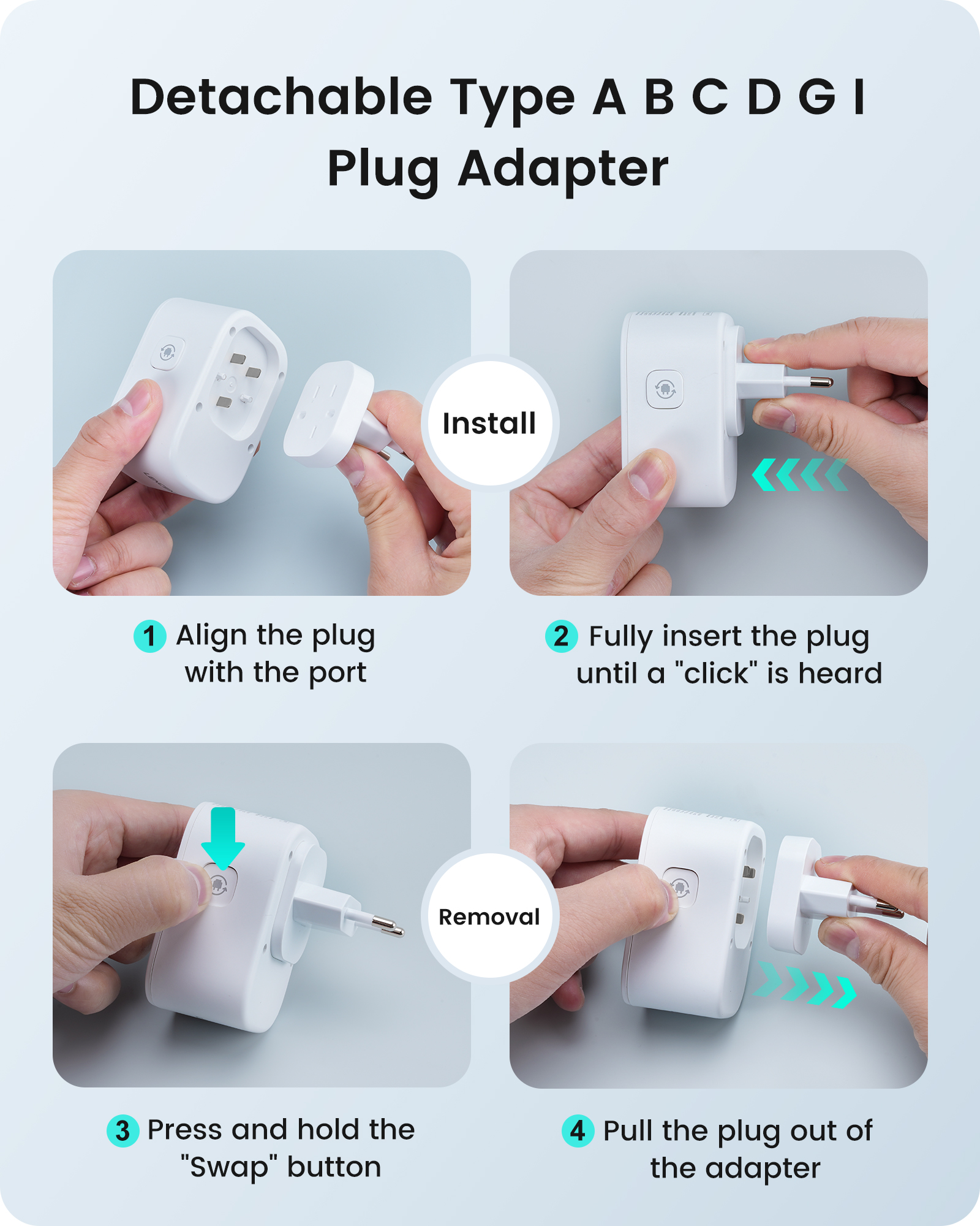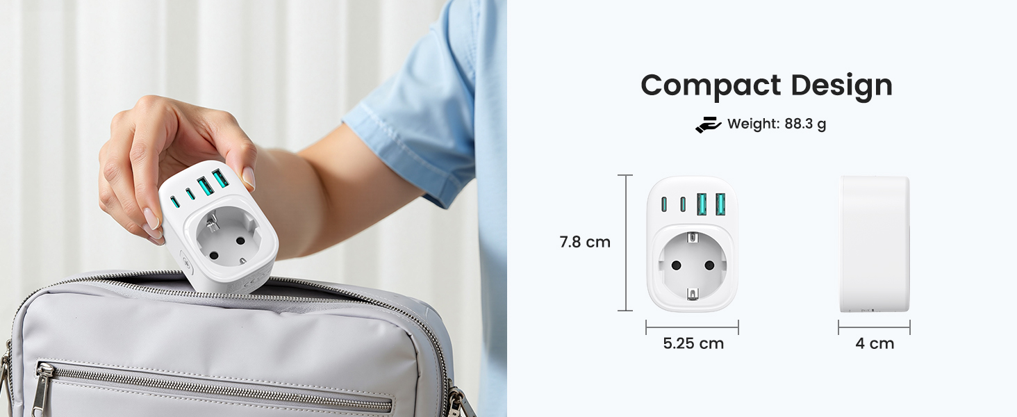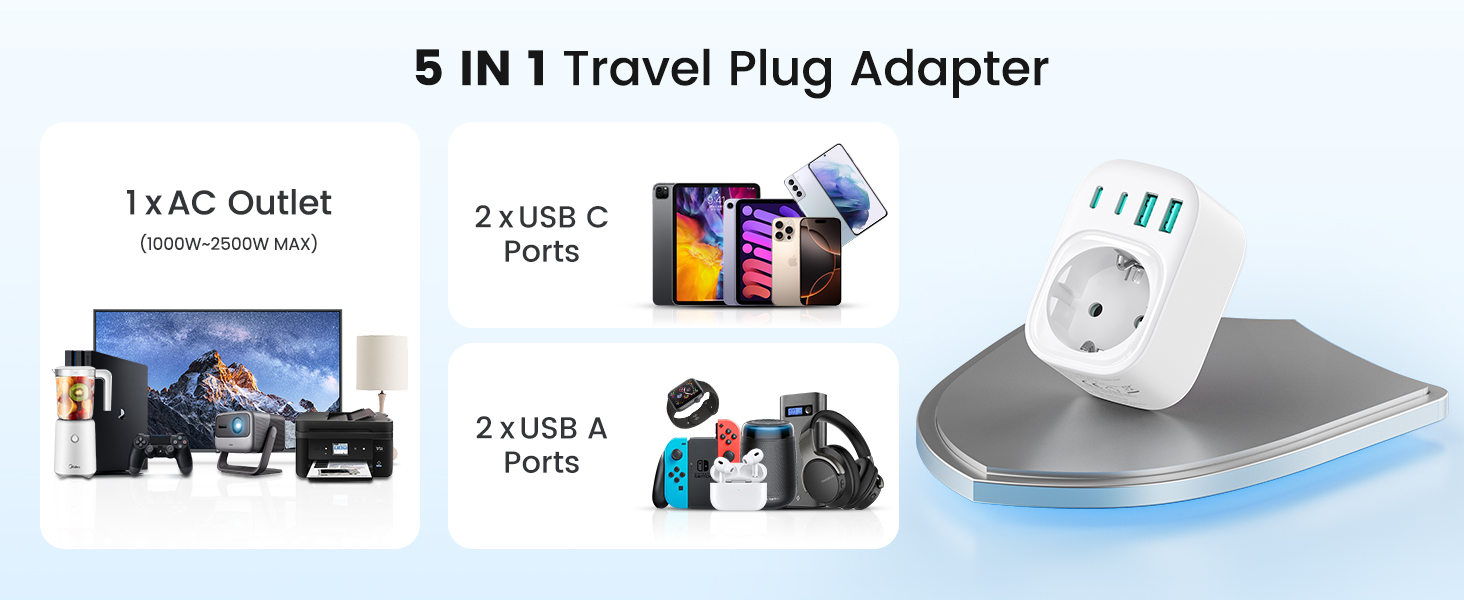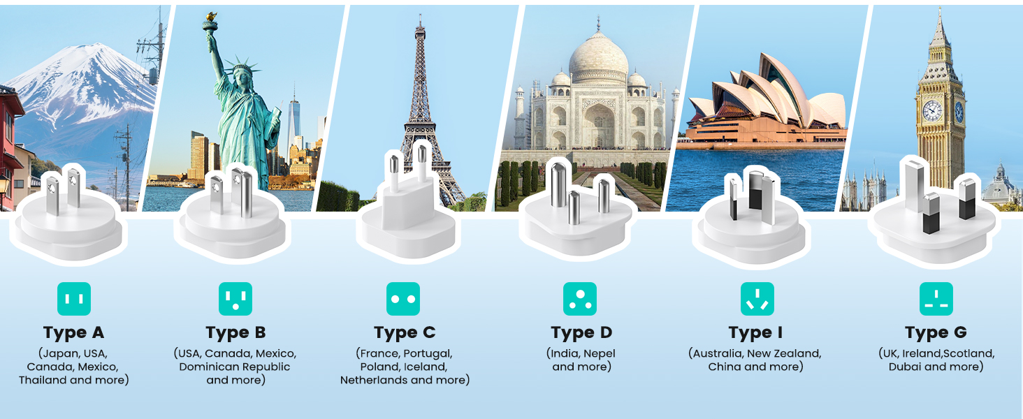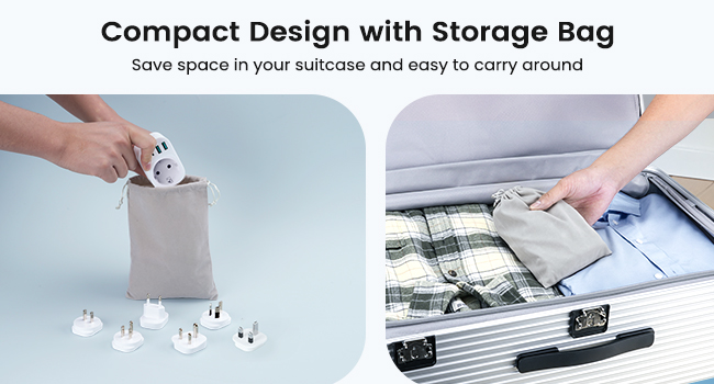 ---[International Travel Adapter] This worldwide travel adapter set includes 6 detachable plug attachments and can be used in over 180 countries, so you no longer need to worry about having the right plug. Type A: Mainly used in Japan, USA, Philippines, Mexico, China, Thailand, Anguilla, Colombia, and other countries. Type B: Mainly used in the USA, Canada, Mexico, Colombia, Thailand, American Samoa, and other countries. Type C: Mainly used in most European countries such as Germany, France, Spain, Italy, the Netherlands, Portugal, Greece, Poland, Turkey, and other countries. --- Type D: Mainly used in India, Nepal, Sri Lanka, Pakistan, and other countries. Type G: Mainly used in the UK, Dubai, Malta, Hong Kong, Ireland, Tanzania, Cyprus, Scotland, and other countries. Type I: Mainly used in Australia, China, Argentina, New Zealand, Fiji, the Cook Islands, Samoa, and other countries. Our universal adapter features six plug types, making it the ideal choice for frequent travelers. ---[USB Fast Charging] This universal travel adapter comes with 1 AC outlet, 2 USB-C ports, and 2 USB-A ports. Advanced technology enables charging speeds of up to 3.0 A / 15 W on USB-C ports and up to 2.4 A / 12 W on USB-A ports, providing power for fast charging of a wide range of USB-powered devices such as smartphones, tablets, laptops, cameras, and more. Ideal for frequent travelers and business travelers. ---[Easy to Use and Carry] A included storage bag accommodates all plug accessories, keeping them within easy reach at all times. You can switch the required plug types anytime, anywhere—operation is extremely simple. Our travel adapter is compact (7.8*5.25*4 cm) and lightweight (88.3 g), taking up very little space in your luggage. Its compact size allows it to fit easily into a backpack or briefcase. ---[NO Voltage Converter] This adapter does not convert voltage from 110V to 220V or vice versa. Please ensure that your hair dryer, hair straightener, CPAP machine, electric toothbrush, or shaver supports dual voltage (100V-240V) before use; otherwise, you may need a separate voltage converter. ---[Switching Plugs] Assembly:① Align the plug with the connector.② Fully insert the plug until a click is heard.Disassembly:③ Press and hold the "Release" button.④ Pull the plug out of the adapter.