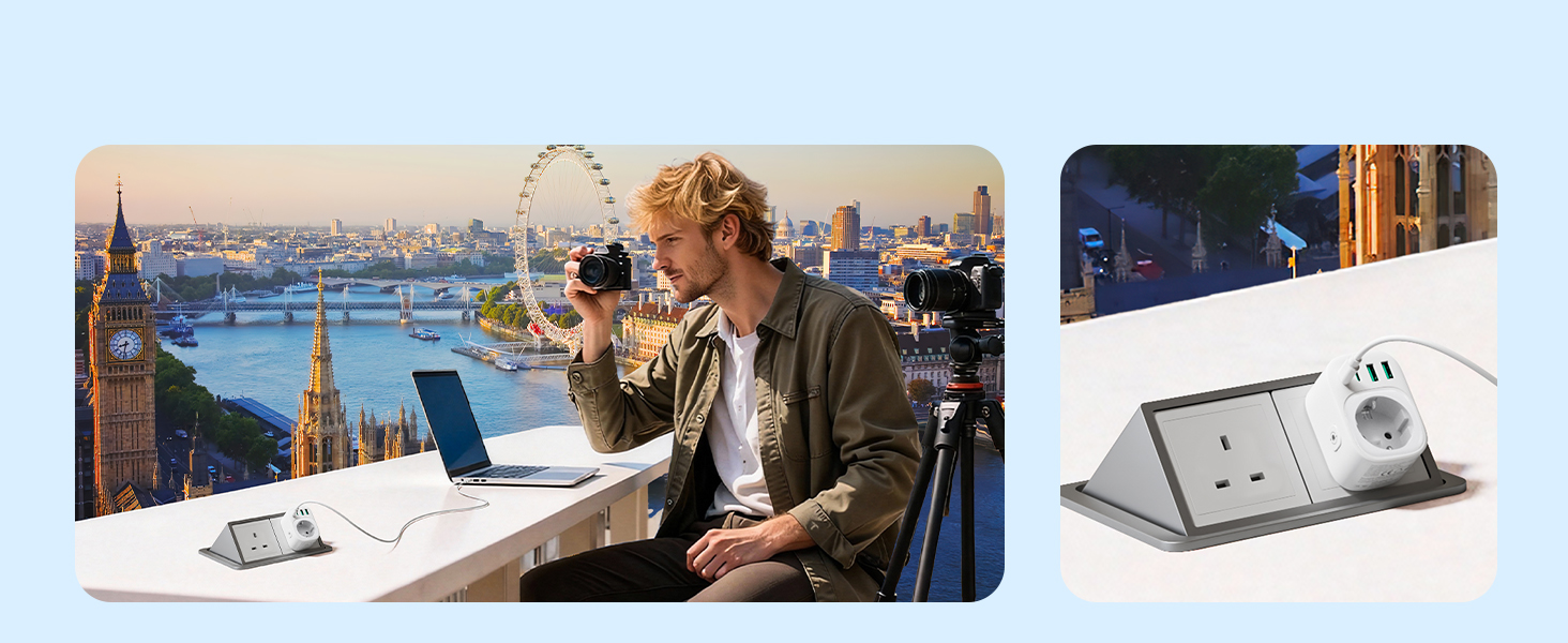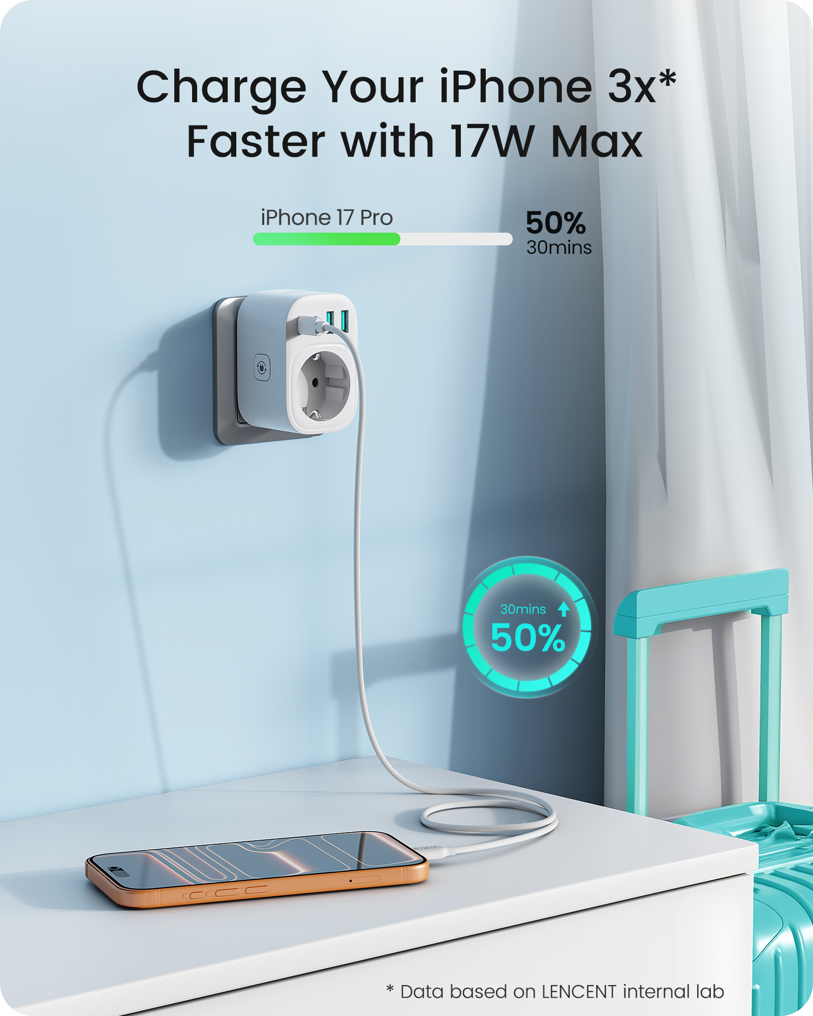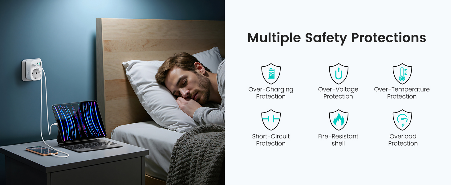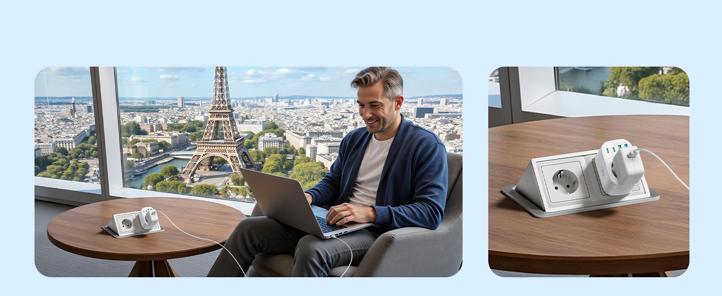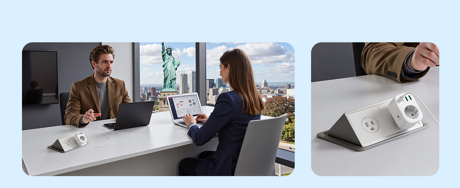 ---[International Travel Adapter] This worldwide travel adapter set includes 6 detachable plug attachments and can be used in over 180 countries, so you no longer need to worry about having the right plug. Type A: Mainly used in Japan, USA, Philippines, Mexico, China, Thailand, Anguilla, Colombia, and other countries. Type B: Mainly used in the USA, Canada, Mexico, Colombia, Thailand, American Samoa, and other countries. Type C: Mainly used in most European countries such as Germany, France, Spain, Italy, the Netherlands, Portugal, Greece, Poland, Turkey, and other countries. --- Type D: Mainly used in India, Nepal, Sri Lanka, Pakistan, and other countries. Type G: Mainly used in the UK, Dubai, Malta, Hong Kong, Ireland, Tanzania, Cyprus, Scotland, and other countries. Type I: Mainly used in Australia, China, Argentina, New Zealand, Fiji, the Cook Islands, Samoa, and other countries. Our universal adapter features six plug types, making it the ideal choice for frequent travelers. ---[USB Fast Charging] This universal travel adapter comes with 1 AC outlet, 2 USB-C ports, and 2 USB-A ports. Advanced technology enables charging speeds of up to 3.0 A / 15 W on USB-C ports and up to 2.4 A / 12 W on USB-A ports, providing power for fast charging of a wide range of USB-powered devices such as smartphones, tablets, laptops, cameras, and more. Ideal for frequent travelers and business travelers. ---[Easy to Use and Carry] A included storage bag accommodates all plug accessories, keeping them within easy reach at all times. You can switch the required plug types anytime, anywhere—operation is extremely simple. Our travel adapter is compact (7.8*5.25*4 cm) and lightweight (88.3 g), taking up very little space in your luggage. Its compact size allows it to fit easily into a backpack or briefcase. ---[NO Voltage Converter] This adapter does not convert voltage from 110V to 220V or vice versa. Please ensure that your hair dryer, hair straightener, CPAP machine, electric toothbrush, or shaver supports dual voltage (100V-240V) before use; otherwise, you may need a separate voltage converter. ---[Switching Plugs] Assembly:① Align the plug with the connector.② Fully insert the plug until a click is heard.Disassembly:③ Press and hold the "Release" button.④ Pull the plug out of the adapter.