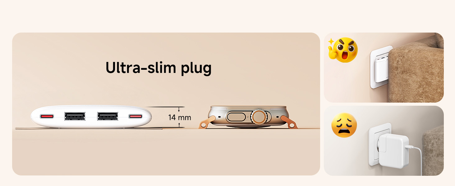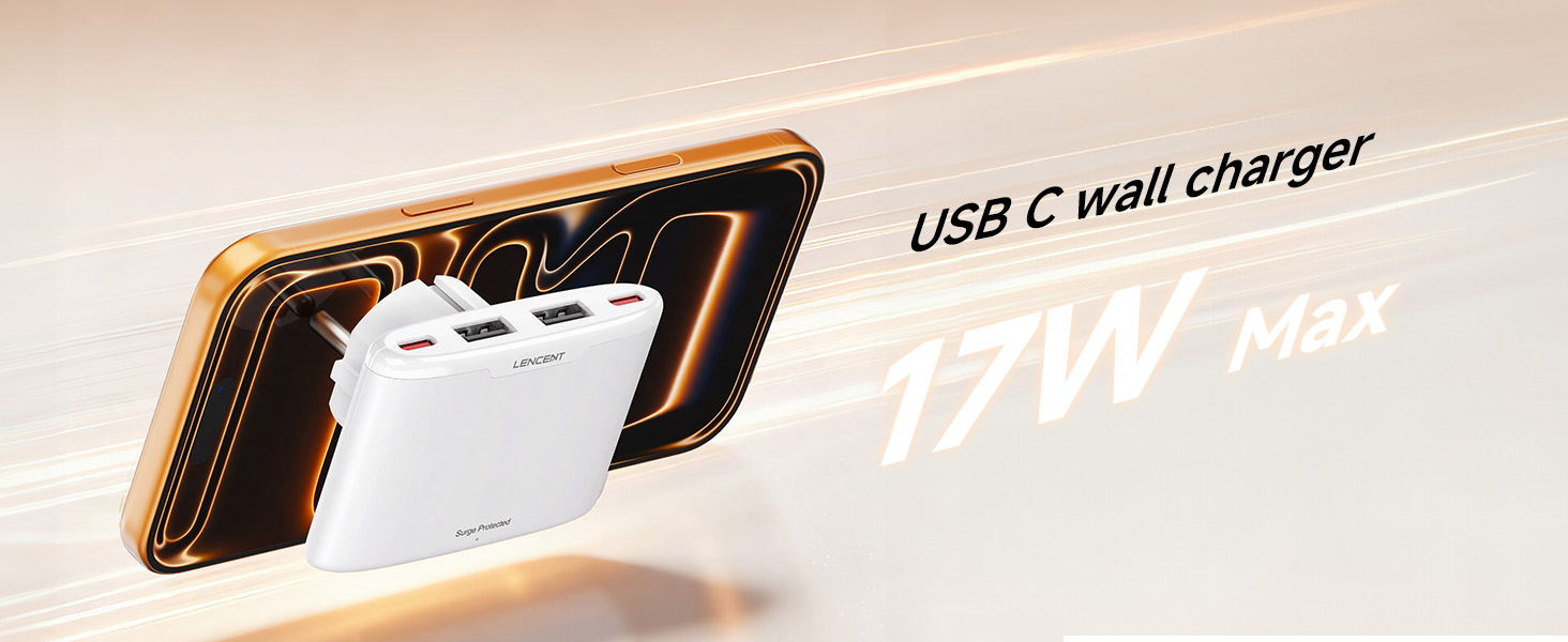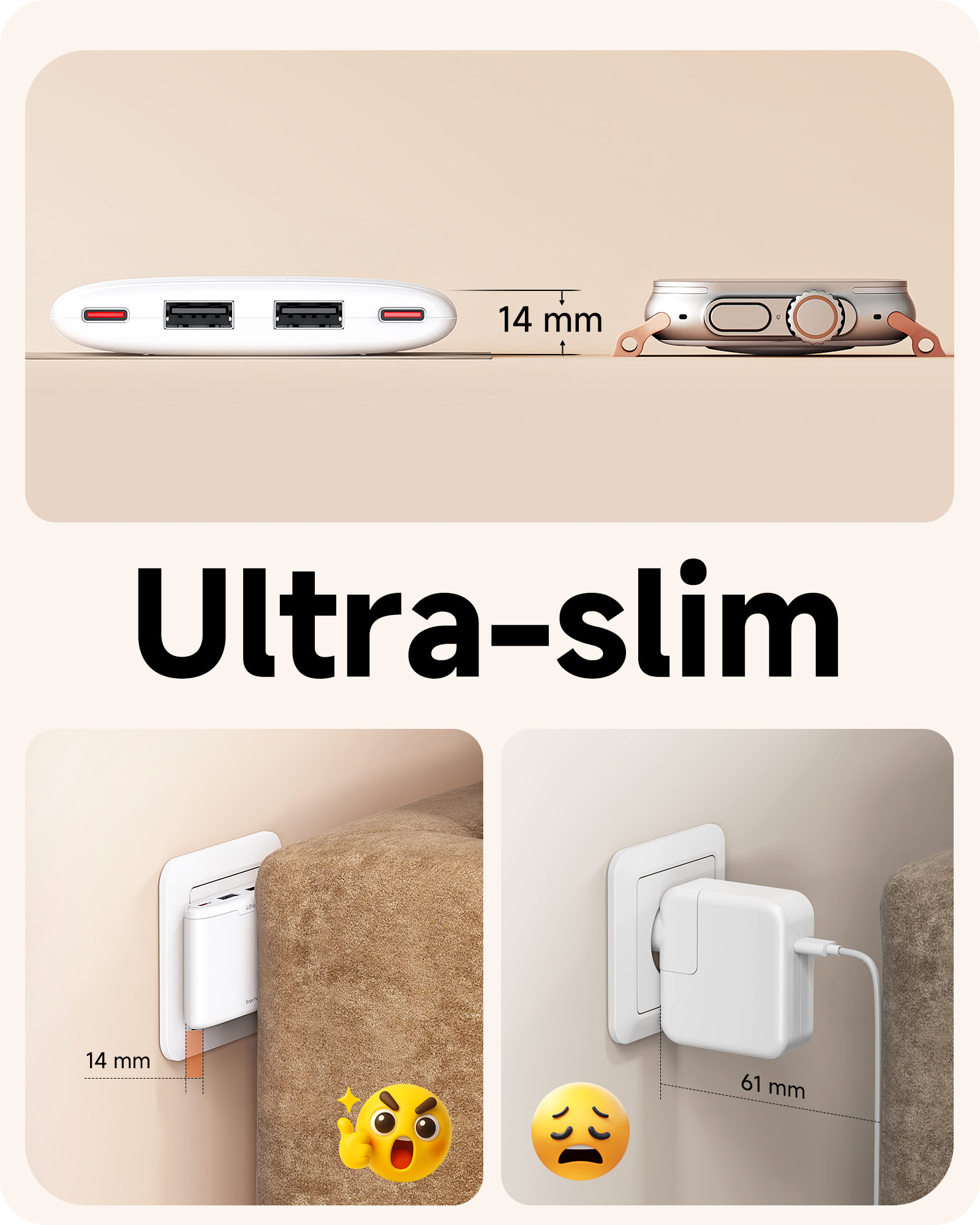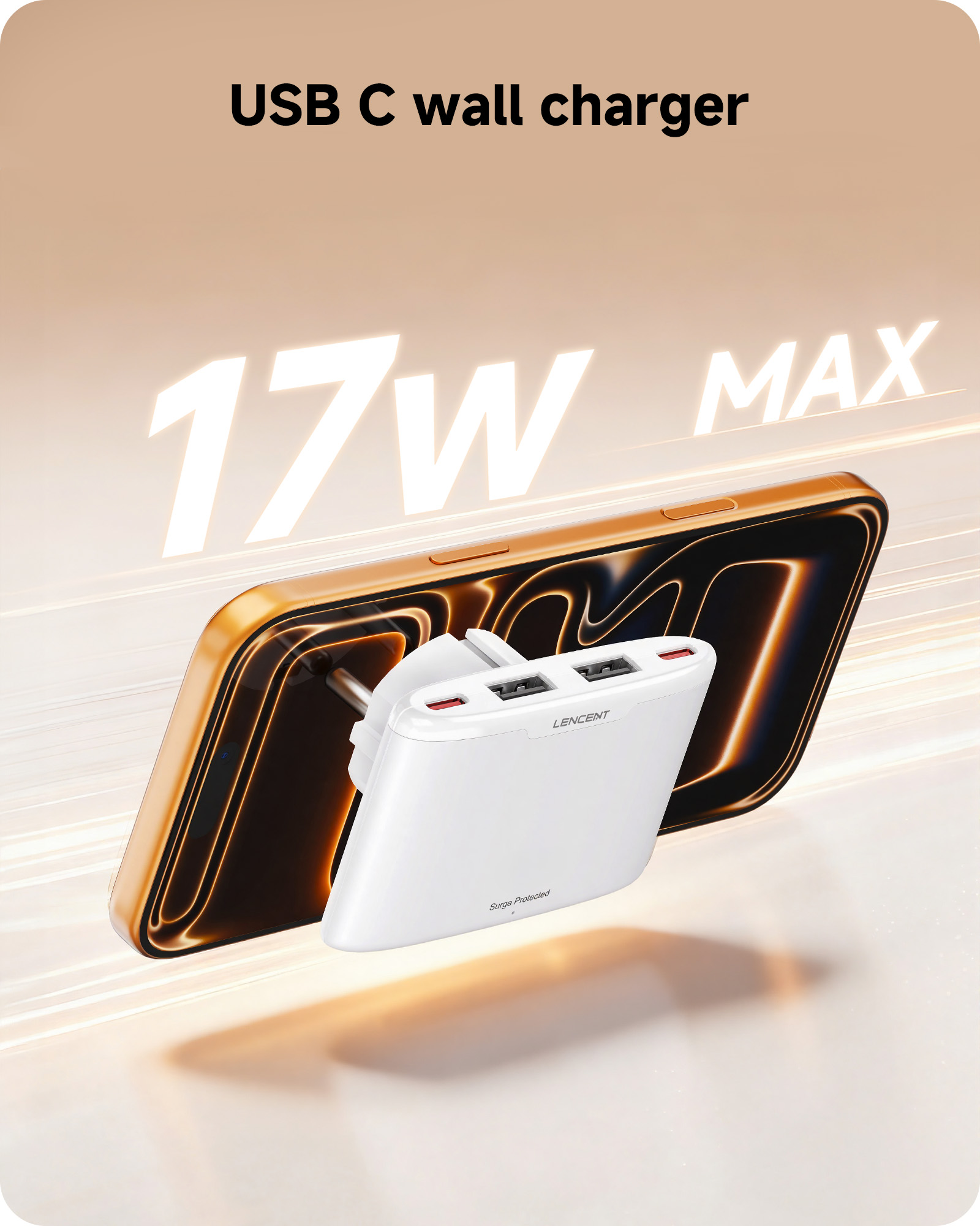 • --- Ultra-Slim & Space-Saving Design: Unlike bulky USB wall chargers, this ultra-slim slim usb wall charger measures just 14 mm thin, allowing it to fit easily into tight spaces. Hide it behind furniture—such as sofas, beds, or nightstands—to charge your devices while keeping your space tidy and clutter-free --- 4-in-1 USB Wall Charger: This flat USB plug adapter converts a single AC outlet into two USB-A and two USB-C ports, allowing you to charge up to four devices simultaneously. Equipped with Smart IC technology, it automatically detects your device to deliver the fastest possible charging speed. With a total output of 17W, it charges 30% faster than a standard 5W USB-C adapter. --- Multi-Protection: Safe charging made simple. Constructed from flame-retardant, durable materials, it features built-in protections including over-voltage, over-current, short-circuit, grounding, and over-temperature protection—ensuring a safe, stable charge for all your devices. --- Compact & Non-blocking Design: Thanks to its practical design, this flat usb wall plug adapter leaves adjacent outlets free for other devices and stays firmly in place. Its portable, lightweight build slides easily into any bag or travel case—perfect for hotels, airports, the office, or everyday home use. --- Wide Compatibility: This slim USB-C plug adapter works with virtually all electronic devices—including iPhone 17/16/15/14/13 series, Samsung Galaxy S series, tablets, AirPods, Nintendo Switch, lamps, speakers, fans, and more