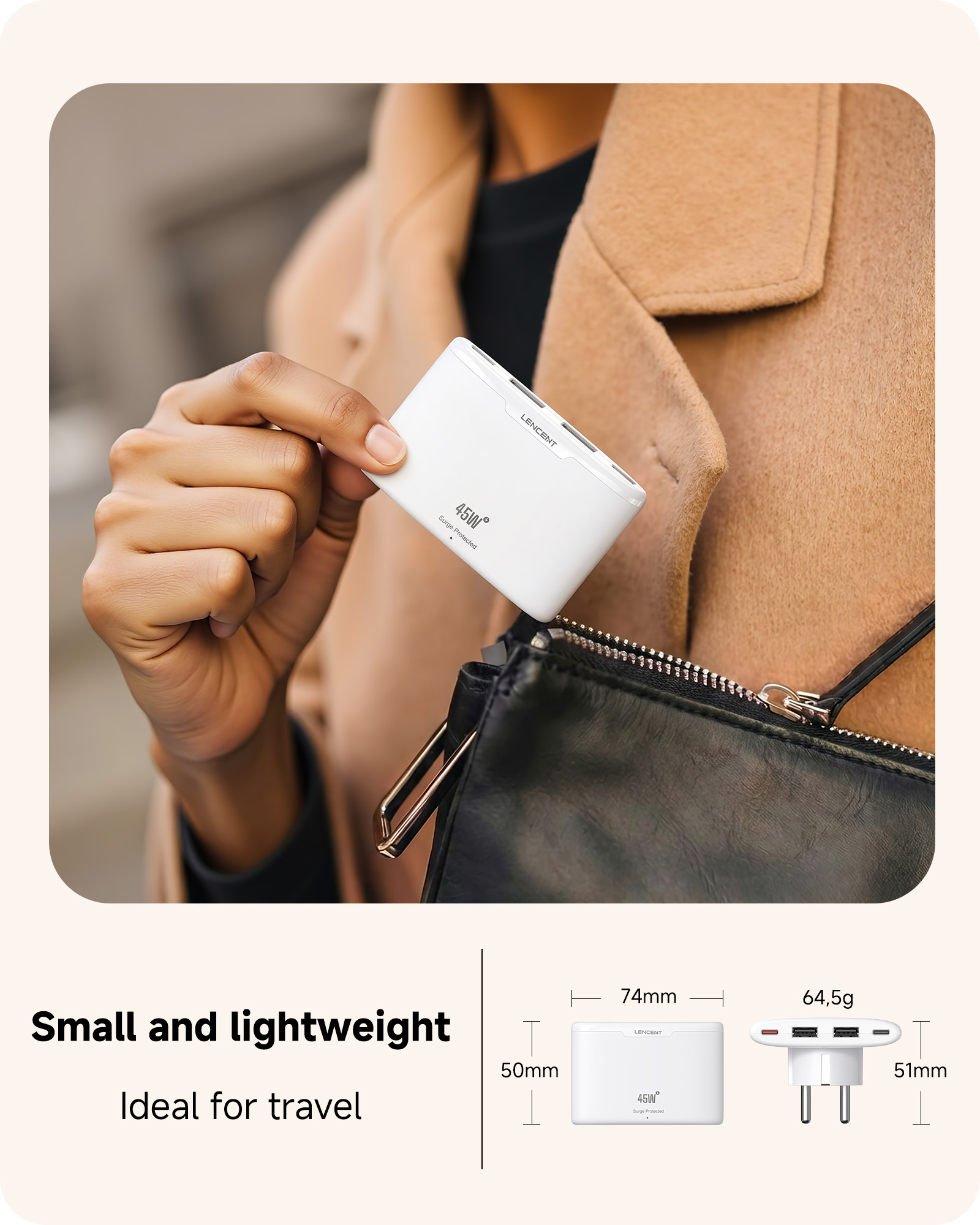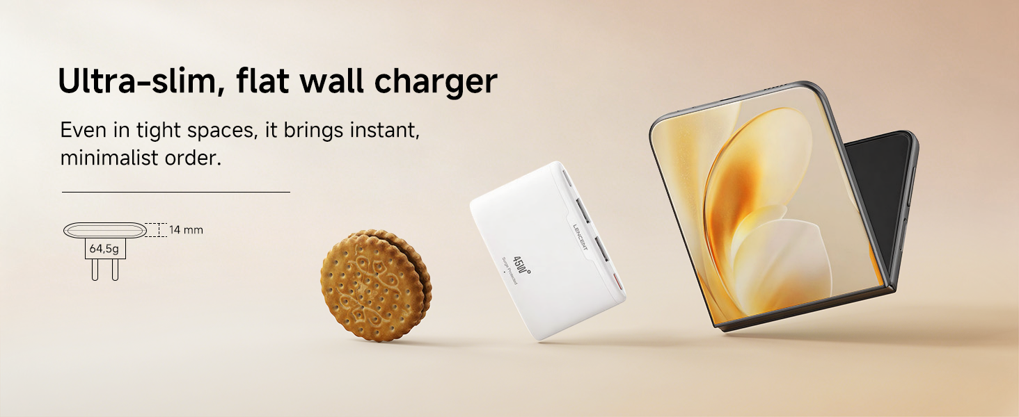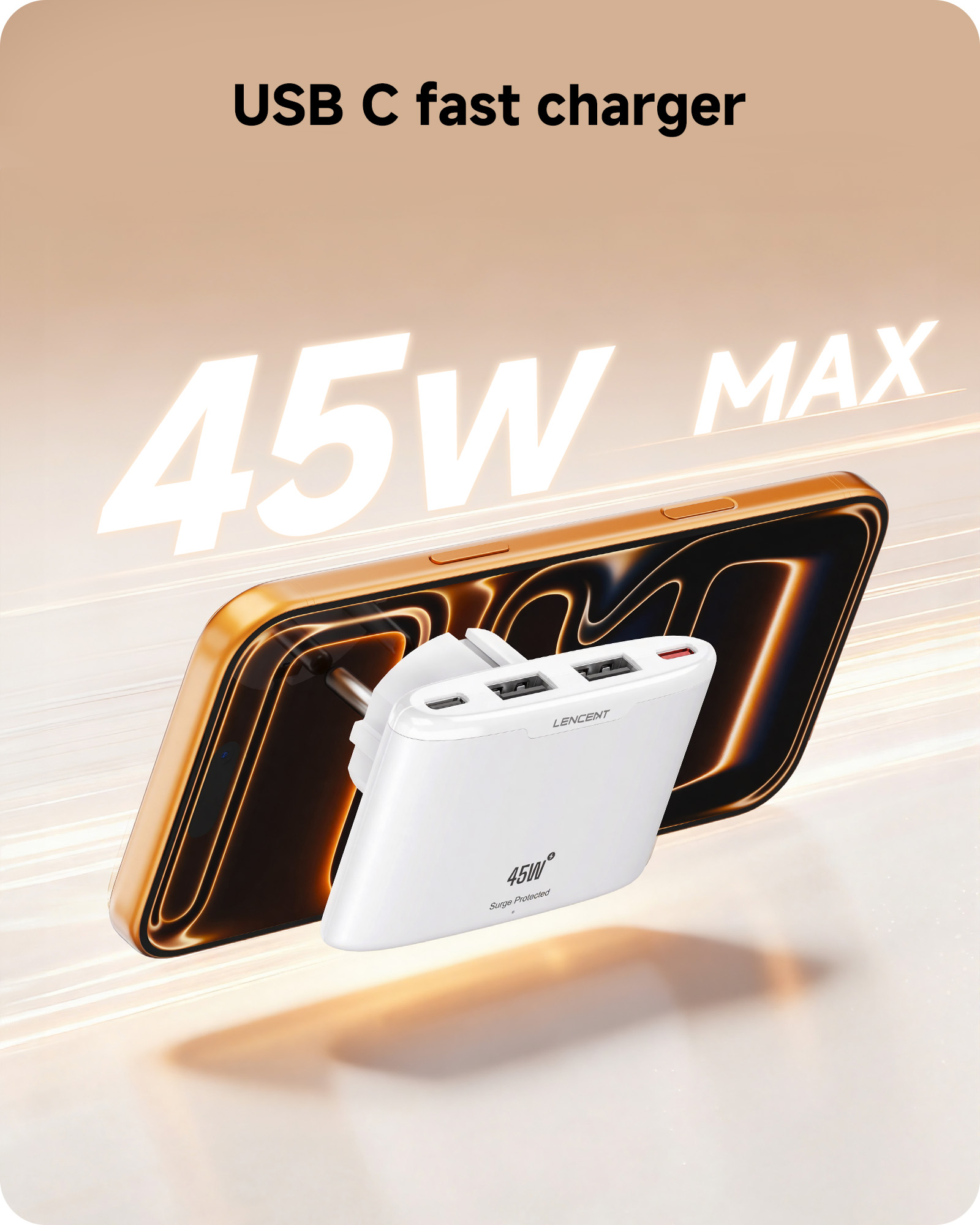 • --- Ultra-Slim & Space-Saving Design: Unlike bulky USB wall chargers, this ultra-slim slim usb wall charger measures just 14 mm thin, allowing it to fit easily into tight spaces. Hide it behind furniture—such as sofas, beds, or nightstands—to charge your devices while keeping your space tidy and clutter-free --- PD 45W Fast Charging: This slim wall charger features two USB-C and two USB-A ports, allowing you to charge up to 4 devices simultaneously with a total output of 45W—delivering charging speeds 80% faster than standard USB-C adapters --- Efficiency GaN Technology: Embedded with a GaN chip and intelligent safety technology, this slim flat charger not only reduces size and weight but also generates less heat, lowers power consumption, and boosts charging efficiency—making your charging experience safer and more convenient --- Multi-Protection: Safe charging made simple. Constructed from flame-retardant, durable materials, it features built-in protections including over-voltage, over-current, short-circuit, grounding, and over-temperature protection—ensuring a safe, stable charge for all your devices. --- Compact & Non-blocking Design: Thanks to its practical design, this flat usb wall plug adapter leaves adjacent outlets free for other devices and stays firmly in place. Its portable, lightweight build slides easily into any bag or travel case—perfect for hotels, airports, the office, or everyday home use. --- Wide Compatibility: This slim USB-C plug adapter works with virtually all electronic devices—including iPhone 17/16/15/14/13 series, Samsung Galaxy S series, tablets, AirPods, Nintendo Switch, lamps, speakers, fans, and more